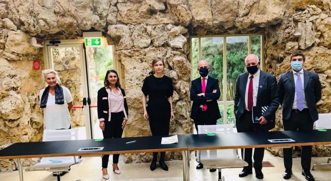 从左至右见证合同的签字分别是:Marilù Faraone Mennella(圣帕特里尼亚诺那不勒斯大使),Valentina Pignotti(国际商务发展经理-Chic),Zane Mellupe(文化外交顾问),Giovanni Lo Storto(LUISS总经理),Sebastiano Maffettone(Ethos创始人),Samuele Valentini(项目协调员-TalentBank)。